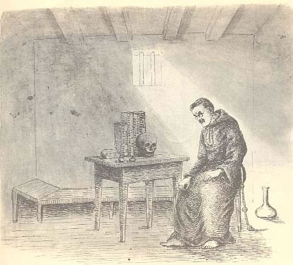 De joven, “calavera”, y de mayor, fraile ( a la española). (Sobre la mesa unos pedazos de pan, obras del cura Mendán, del Arcipreste de Hita, del abad de Dulaurens y del Cardenal Bembo.)
